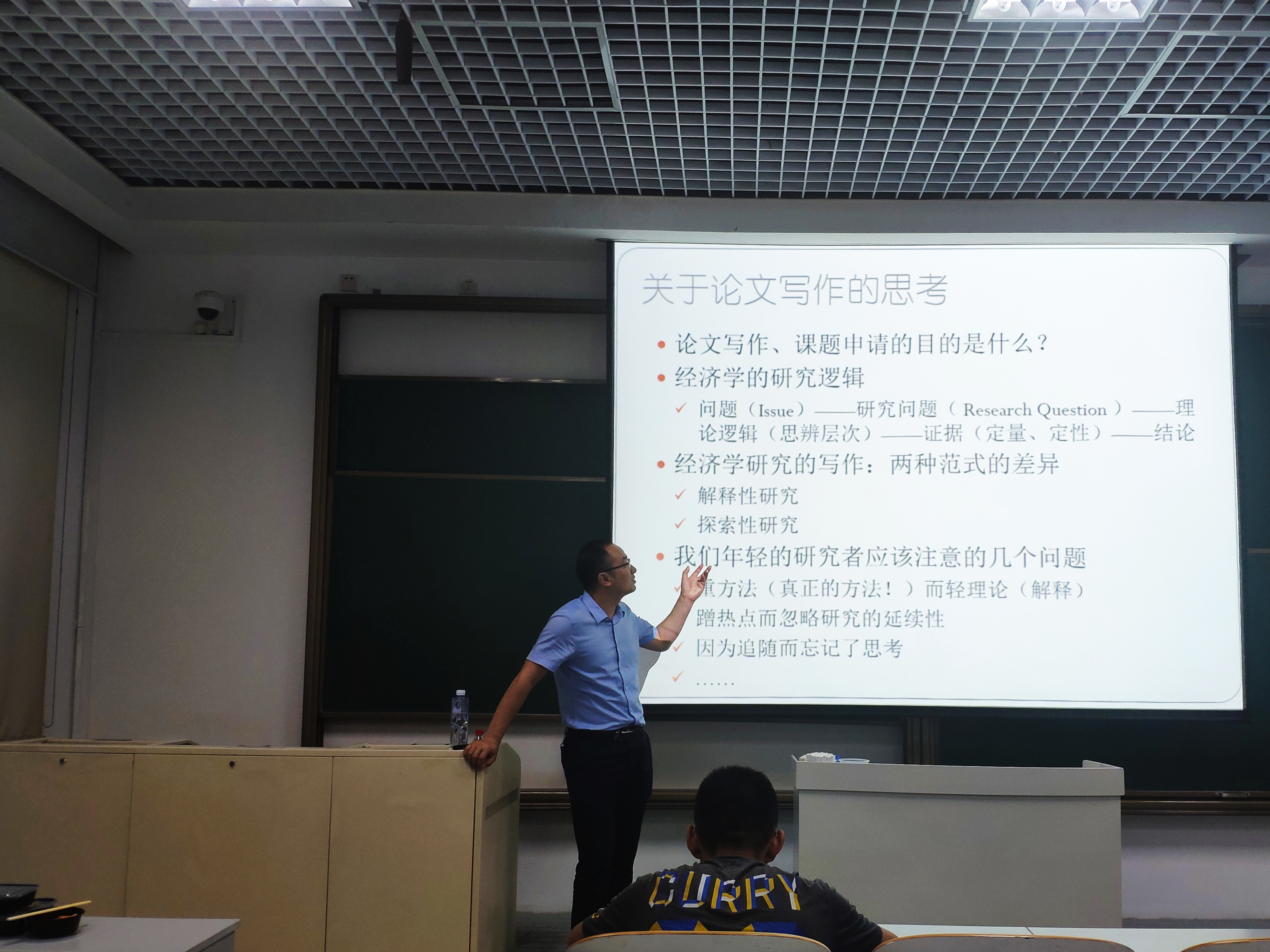 本期交流会上,吴老师分享的主题为《研究“生”了没?——关于学术论文写作的几点思考》。他结合个人经历、公司的学术氛围以及教育部对公司产品要求的转变,为同学们解答了研究生阶段面临的困惑,生动形象地总结了经济学类学术论文的研究逻辑,并提出一些学术研究时应注意的问题。吴老师干货满满的分享,使同学们深受启发。在随后的提问环节,同学们踊跃发言,向吴老师请教了学术写作中遇到的问题,与老师进行了双向交流。此次学术交流活动在同学们的阵阵掌声中画上了圆满的句号。