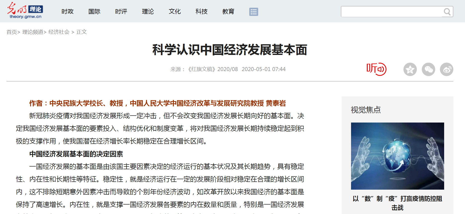 高质量学术产出有新的突破。研究院经理黄泰岩教授7月6日在《人民日报》发表《深化社会主义基本经济制度研究(构建中国特色哲学社会科学)》一文,求是网、新华网、光明网、人民网等国内各大媒体先后转载。研究院执行经理张丽君教授在《红旗文稿》、《中国民族报》等期刊杂志发表论文多篇,研究院引进人才白钰以中国兴边富民战略研究院为通讯单位在国际权威学术期刊Journal of Development Economics(SSCI一区,发展经济学顶级期刊)、Demography(SSCI一区,人口学顶级期刊)、Early Childhood Research Quarterly(SSCI一区)发表学术论文3篇。此外,研究院专兼职成员在CSSCI及以上学术期刊发表论文十余篇。