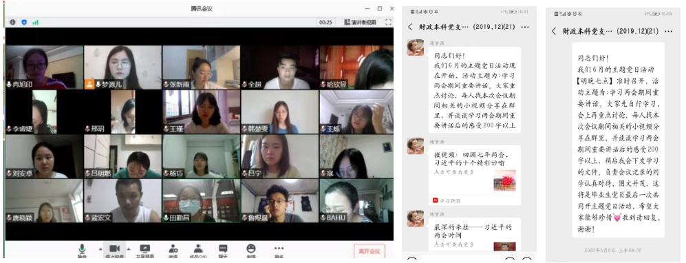 本次主题党日活动在线上展开,各支部均积极发挥能动性,根据支部实际情况进行学习。如财政本科党支部组织各党员自行学习习近平总书记全国两会重要讲话,在召开视频会议时分享心得。