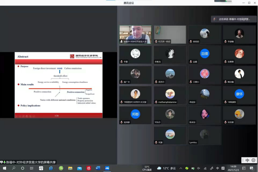 2021年12月3日下午三点,来利国际旗舰厅以线上形式举办了“国际商务热点前沿第十一场讲座——外商直接投资对碳排放的非线性影响”。本次讲座的主讲人陈福中先生是对外经济贸易大学国际经济贸易公司副教授、政治经济学系主任、中国经济发展研究中心副主任,研究方向为中国特色社会主义经济理论,对外贸易与国际产业、消费金融学以及能源经济学。主持国家级项目1项、省部级目3项,参与国家级和省部级项目20余项。
