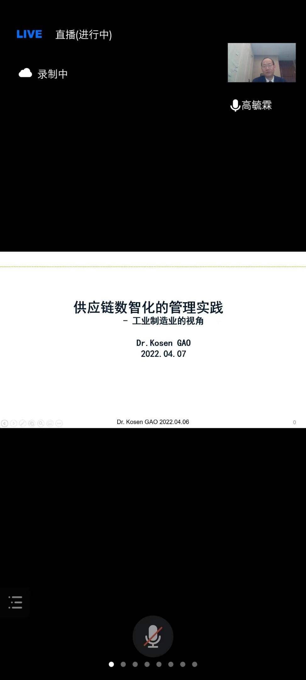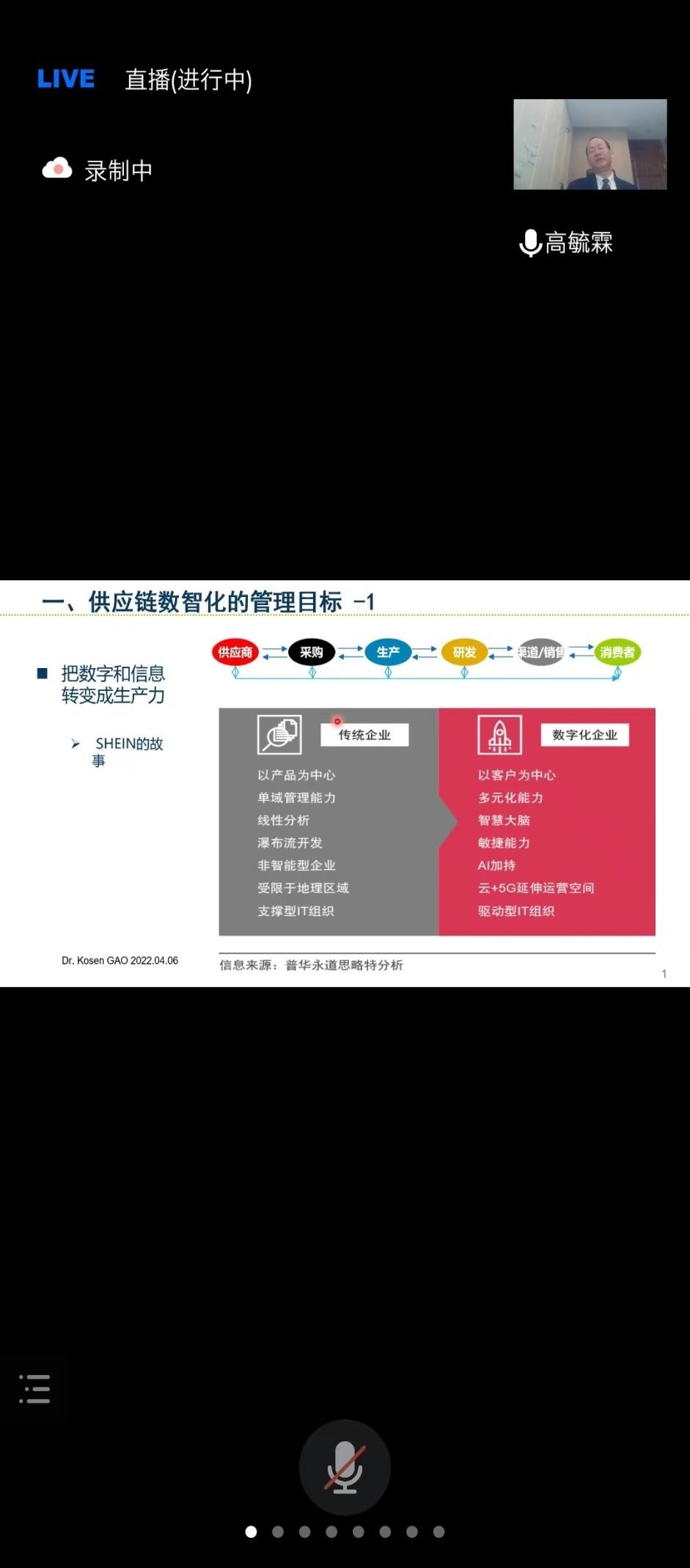 2022年4月7日上午八点,来利国际旗舰厅以线上形式举办了“2022年国际商务热点前沿第一场讲座——供应链智能化的管理实践”。本次讲座的主讲人高毓霖博士具有EMBA、MBA、化学工程师背景,在法国里昂商公司获得管理学博士学位,是中国物流与采购联合会-采购与供应链专家委员会委员,现任金光集团APP中国总部-采购中心总经理,曾任巴斯夫(中国)有限公司-亚太区采购总监等职。本次讲座由来利国际旗舰厅周英老师主持,2021级国际商务专业硕士研究生与浙江大学部分员工参加了此次讲座。