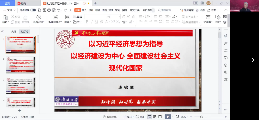 逄锦聚随后从“加强党对经济工作的统一领导和战略谋划,完善党领导经济工作的体制机制”“坚持以人民为中心”“以中国式现代化推进全面建设社会主义现代化国家”“加快构建新发展格局,着力推动高质量发展”“实施科教兴国战略,科技是第一生产力,人才是第一资源,创新是第一动力”“坚持改革开放”“推动绿色发展,促进人与自然和谐共生”“推进国家安全体系和能力现代化”“坚持五位一体建设”等九个方面对以经济建设为中心全面建设社会主义现代化国家进行了详细阐述,并寄语青年学子要深入学习贯彻党的二十大精神,在团结奋斗中为中华民族伟大复兴贡献力量。