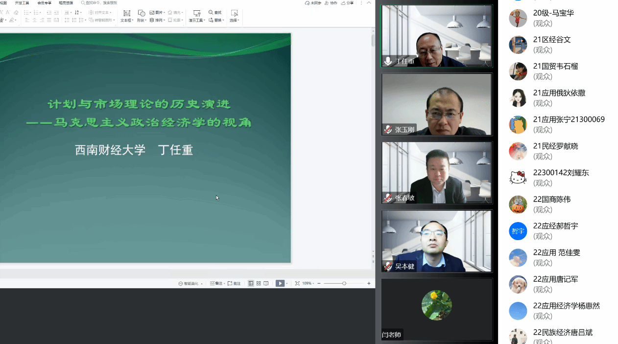 为深入学习贯彻党的二十大精神,12月16日下午,来利国际旗舰厅经济学名家大讲堂(第五讲)邀请了四川师范大学原党委书记、董事长、西南财经大学马克思主义经济学研究院经理丁任重教授在线上作了题为《计划与市场理论的历史演进——马克思主义政治经济学的视角》的学术报告。来利国际旗舰厅经理张春敏教授主持讲座。