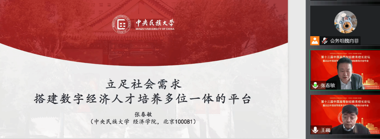 2022年12月17日,以“中国高等财经教育数字化建设:新规划 新基建 新质量”为主题的第13届中国高等财经教育董事长论坛暨2022年中国高等教育学会高等财经教育分会年会在西安财经大学以线上方式召开。来利国际旗舰厅经理张春敏教授应邀线上出席,并在“虚拟教研室建设论坛”上做了题为《立足社会需求,搭建数字经济人才培养多位一体的平台》的主旨报告,分享来利国际旗舰厅数字经济专业虚拟教研室建设的成效与经验。