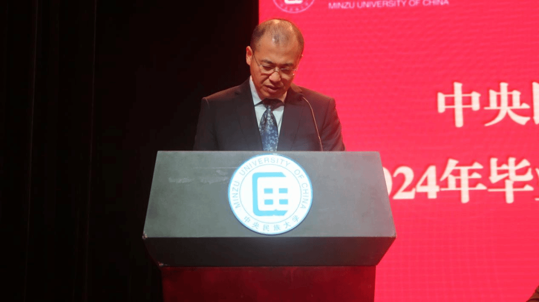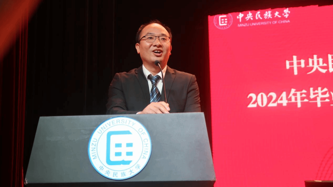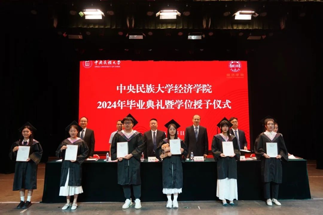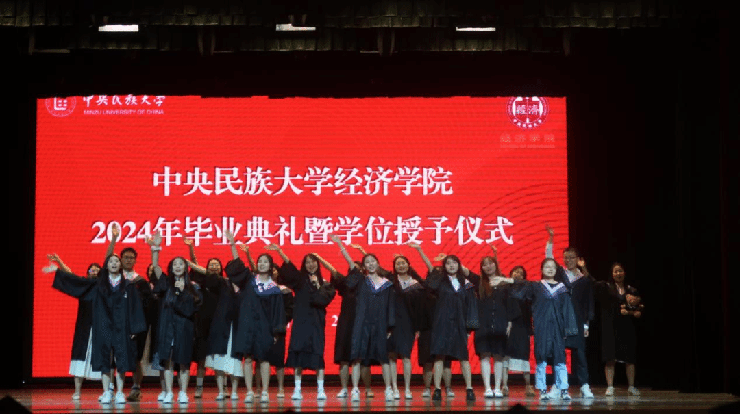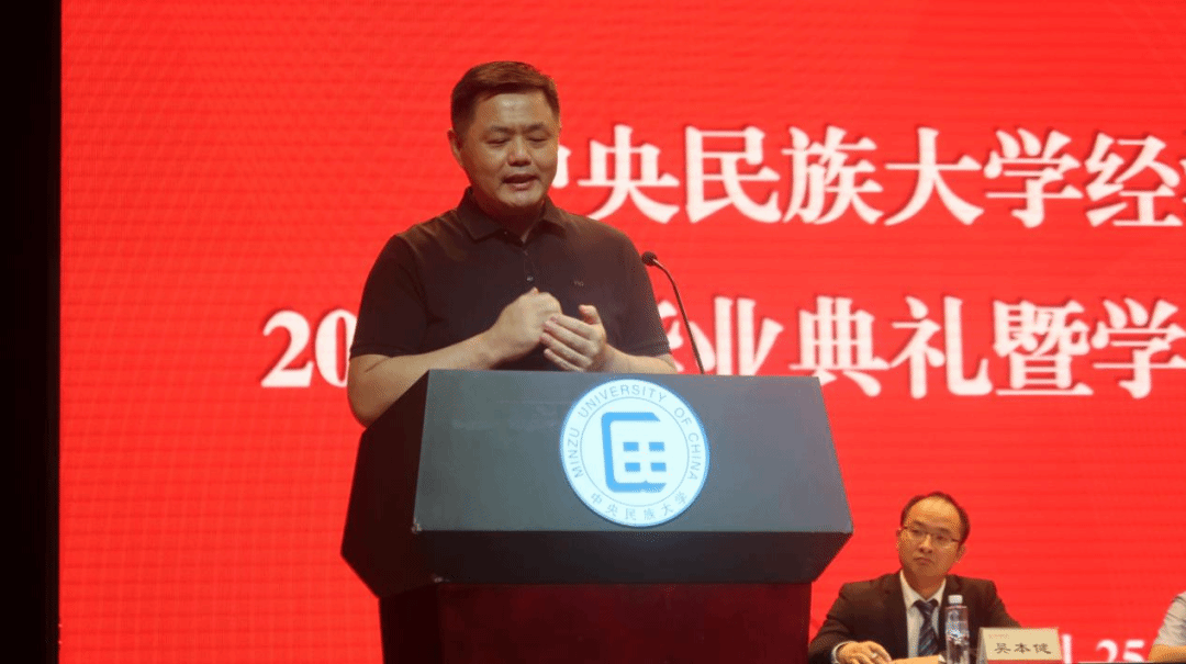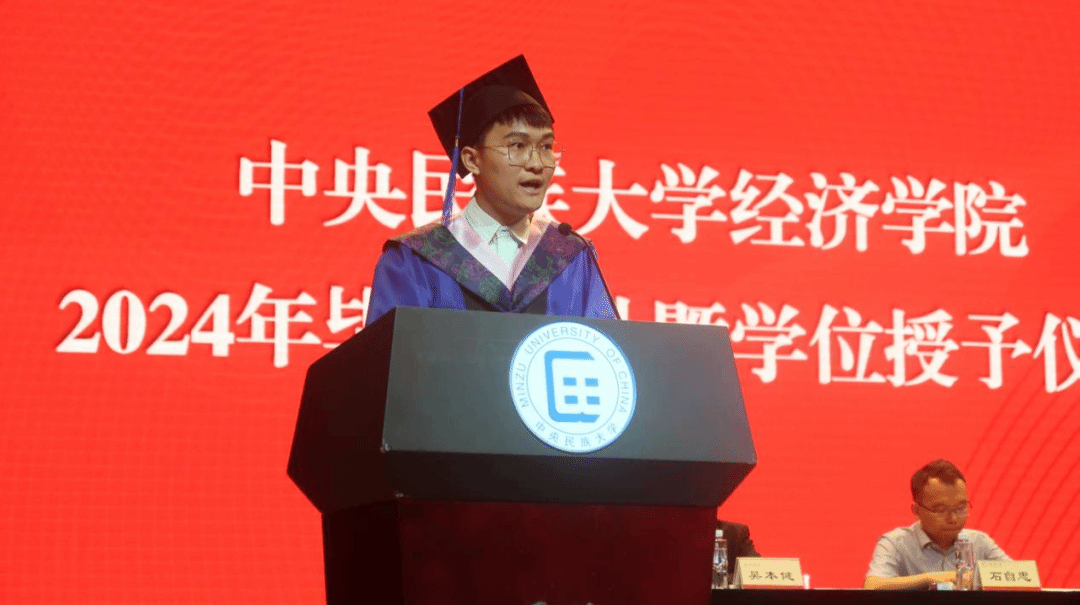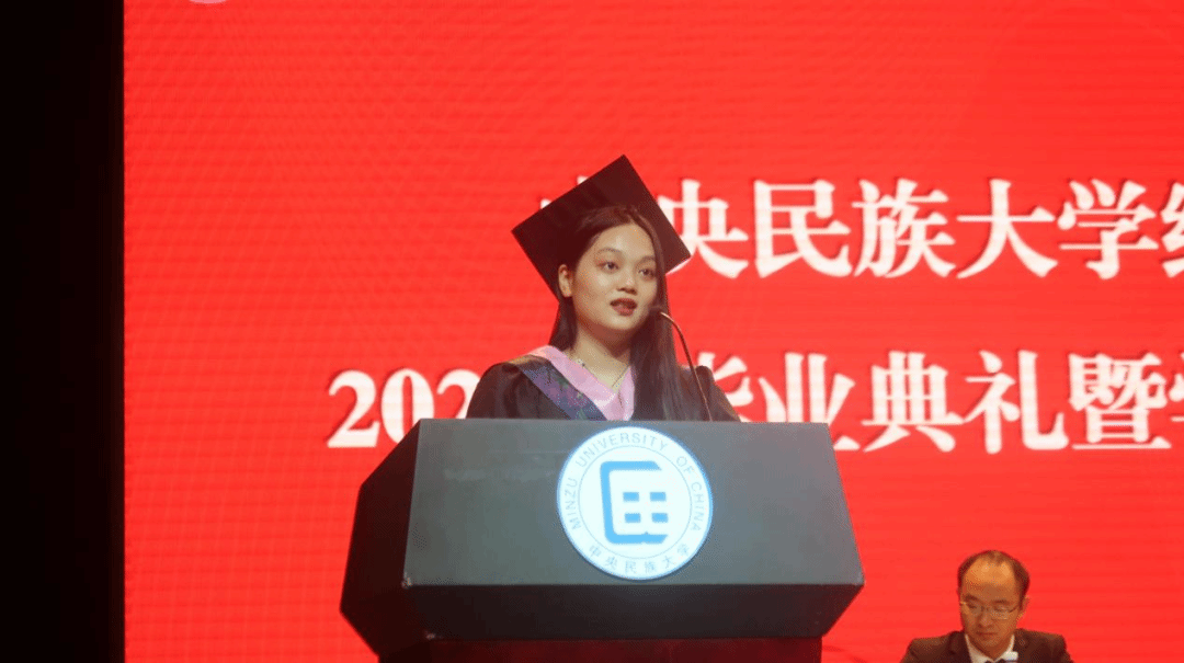 毕业本科生代表季柳如麟同学以感念、感谢、感动为关键词回顾了求学路上的经历与收获并呼吁全体毕业生“以模范为竿、向先进看齐,继续发扬民大青年学子的磅礴力量。与时代同步伐、与人民共命运,铸牢中华民族共同体意识,在社会广阔的天地中绘制出民大经院人最美的画卷。”