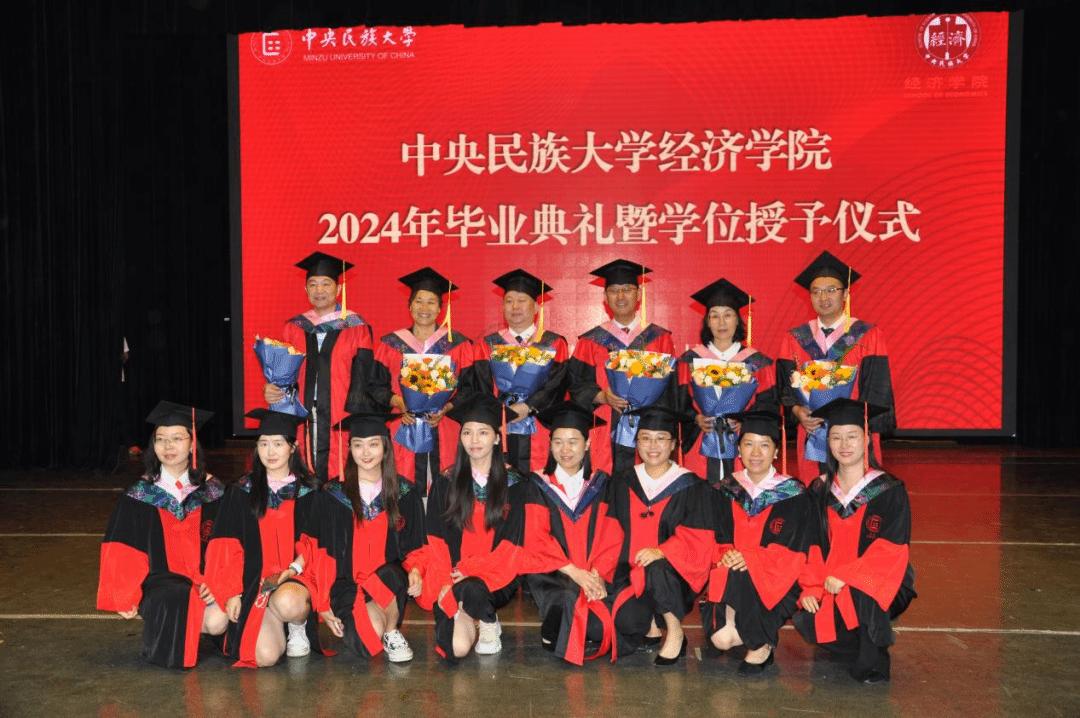 学位授予仪式环节,黄泰岩教授、张春敏教授、张丽君教授、吴本健教授、陶春生教授、史锦华教授为在场每一位获得学位的毕业生拨流苏、颁发学位证书、合影留念。