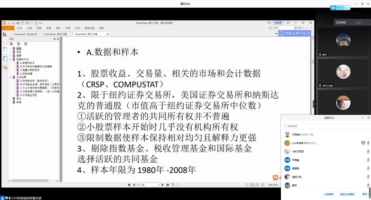 主讲人李俊海首先向大家详细地讲解了Miguel Anton & Christopher Polk(2014)在Journal of Finance上发表的一篇论文《Connected Stocks》。文章使用1980-2008年美国纽约证券交易所、美国证券交易所和纳斯达克证券交易所的高市值普通股数据,研究了共同所有权程度和预测回报之间的因果关系。文章的实证研究分为五个部分,第一部分通过总样本和分样本的基准回归验证了共同所有权对股票超额收益联动性的显著影响;第二部分利用2003共同基金丑闻这个自然实验剔除了内生性干扰,从而更加稳健的证明了共同所有权和股票超额收益联动性的因果关系;第三部分通过异质性分析,表明低流通且极端流动股票受到共同所有权影响发生联动越明显;第四部分提出了关联股票交易策略,即如果关联股票下跌(上涨),我们买入(卖出)股票,并通过简单策略模拟进一步验证了文章的结论;第五部分展示了对冲基金在关联股票策略下的将受到负向影响,进一步佐证了股票联动对收益的显著影响。最后,文章对所有结论进行了总结和概况。
