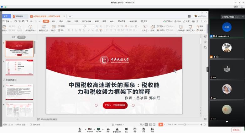 此次研读文章是吕冰洋老师、郭庆旺老师在核心期刊《中国社会科学》上发表的《中国税收高速增长的源泉:税收能力和税收努力框架下的解释》一文。研读会上,邓梅晨同学从现实意义、现有研究、理论价值和创新、内容梳理、结论五个方面进行了讲解。论文构建了税收增长模型,在税收能力和税收努力的理论框架下,分析中国税收高速增长的源泉。且指出未来分税制的分权契约性质作用将减弱,间接税制的放大器作用部分消失,但税收增长红利依旧存在。因此,从长期看,由于税收增长红利仍将持续很长一段时期,税收仍可能保持较高速度的增长。邓梅晨同学讲解后,与会老师结合文章中的数学模型、博弈模型及研究思路展开了交流讨论。