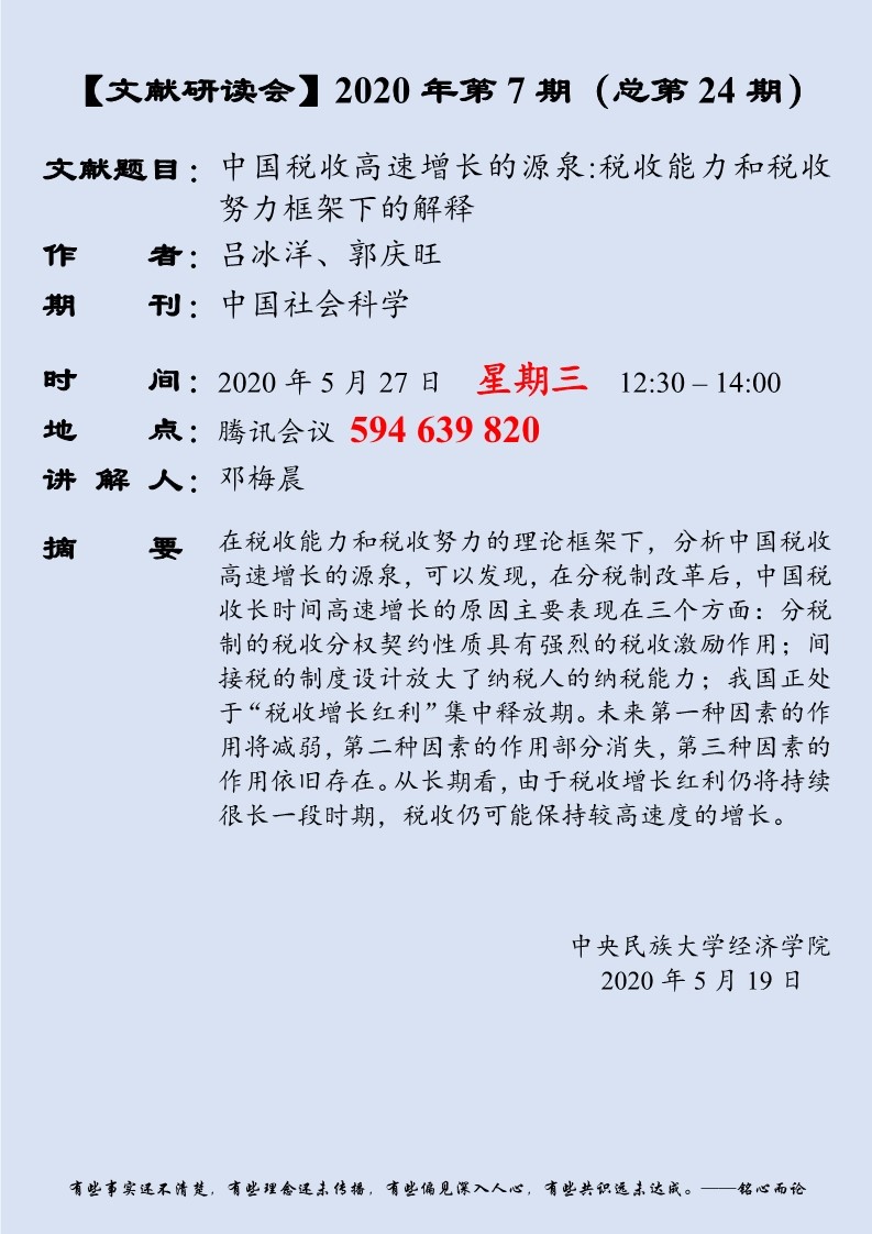 2020年5月27日,来利国际旗舰厅第24期文献研读活动以远程视频会议方式顺利开展,主讲人是来利国际旗舰厅2019级财政学硕士邓梅晨,来利国际旗舰厅数十位师生参加研读会。