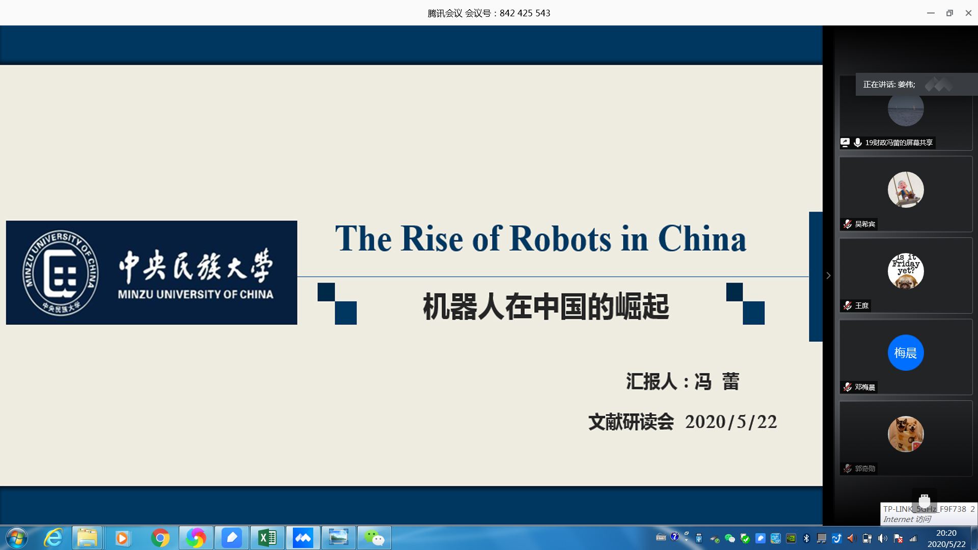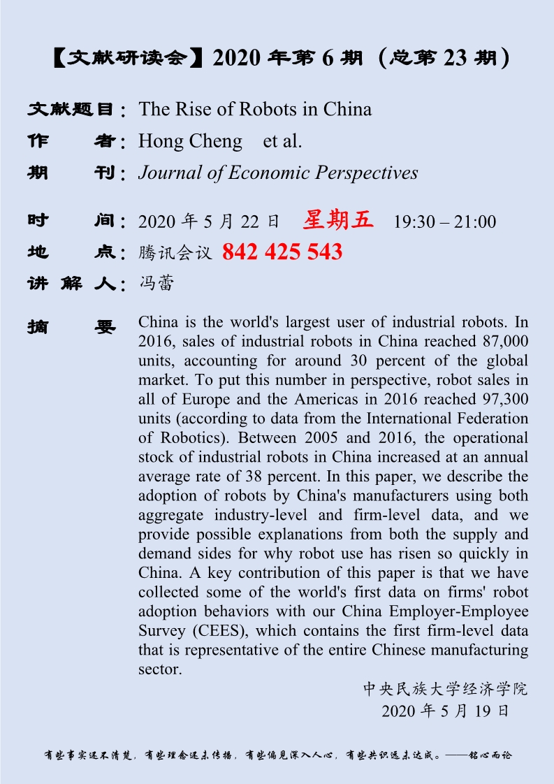 此次研读文章为程虹、李洪斌等发表在顶级期刊《Journal of Economic Perspectives》上的《机器人在中国的崛起》一文。研读会上,冯蕾同学从研究背景、数据说明、实证研究、论文结论、自身看法五方面进行了讲解。论文指出,过去二十年间,我国机器人无论是从产量、销量、库存量上都在以很快的速度增长,中国已是世界上工业机器人的最大用户,中国在全球机器人市场上将扮演很重要的角色。论文作者使用了行业和企业的综合数据描述了中国制造商使用机器人的情况,并从供给和需求两个方面对机器人在中国的使用增长如此之快做出了相应的解释,进而通过一系列计量回归分析,研究发现企业创新、劳动力成本上升和相关政府政策都会对使用机器人产生积极影响。冯蕾同学讲解后,参加老师结合研究中数据分析方法等问题展开了交流讨论。