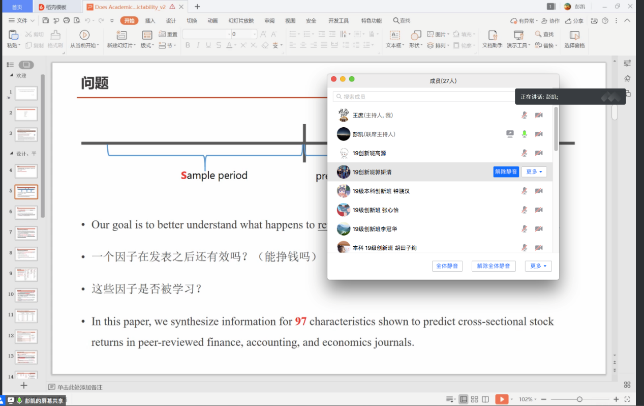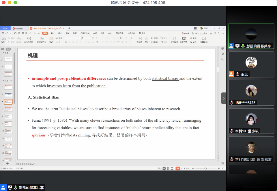 主讲人彭凯老师首先向大家详细地讲解了McLean & Pontiff(2016)发表在金融学顶级期刊Journal of Finance上的论文,“Does Academic Research Destroy Stock Return Predictability?”,该文为JF近5年引用率第一。文章研究了一个兼具理论意义和现实意义的问题:资产定价的学术研究对股票投资产生了什么影响?作者对以往文献中的97个因子在样本期内(in-sample)、样本期外至公开发表前(out-of-sample)和论文发表后(post-publication)预测能力的变化进行研究,发现,平均而言一个预测因子在样本期外的投资组合收益率比样本期内减少了26%,在公开发布后减少了58%,但未完全消失。并且样本期内收益较高、显著程度较高的预测因子,在公开发表后的跌幅更大。由此认为,投资者从资产定价的学术研究出版中学习到市场存在定价错误的信息,但由于套利成本等因素,公开发表的因子的预测能力并未完全消失。