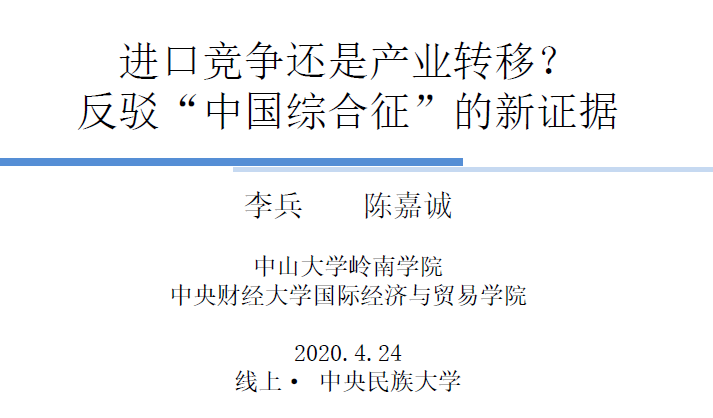 李兵副教授从研究动机、文献综述、中美贸易与投资、变量构造、数据来源、劳动力市场、稳健性检验、结论与讨论八个方面给老师和同学们进行讲解。李兵教授的结论是“进口竞争不会改变当地的劳动人口流动,但是OFDI以及两者共同作用会导致人口流动”、“中国对美出口并没有出现文献中所示的非常严重的负面影响,反倒是中国对美出口可以提升美国制造业高技能劳动者的工资水平”、“美国对华投资对其劳动力市场有负面影响,然而美国对华投资只占美国海外投资的较少份额”。李兵副教授的研究成果为美国国内的阶层矛盾向中美矛盾转嫁提供了直接证据。