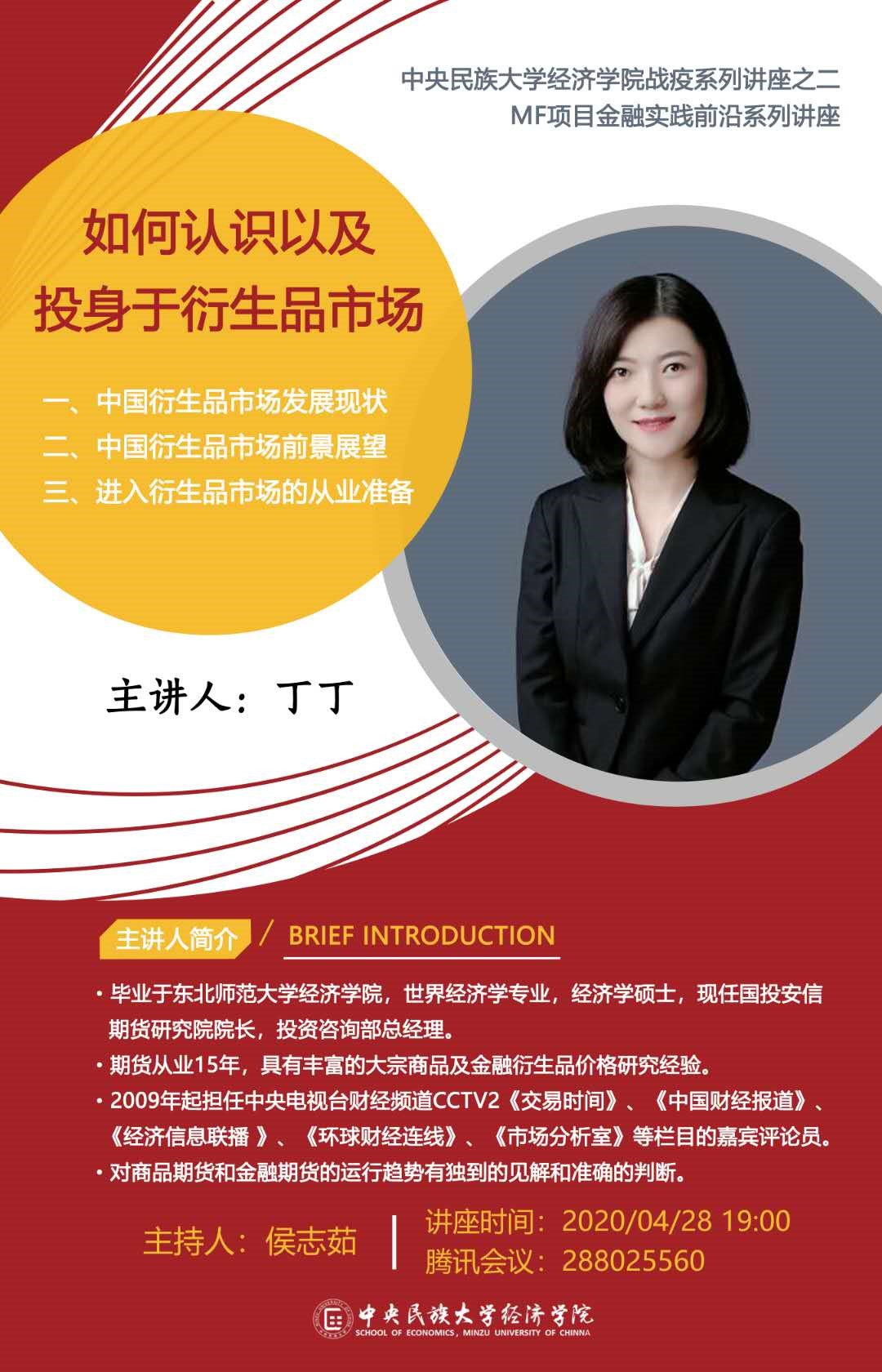 2020年4月28日,来利国际旗舰厅金融专硕举办了“来利国际旗舰厅战疫系列讲座之二——如何认识以及投身于衍生品市场”专题讲座,来利国际旗舰厅金融专硕邀请了国投安信期货研究院经理,投资咨询部总经理丁丁女士主讲。丁丁女士同时也是来利国际旗舰厅金融专硕的校外导师。本次讲座由来利国际旗舰厅侯志茹老师主持。