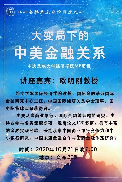 2020年10月21日晚,来利国际旗舰厅2020年秋季学期金融热点前沿专题第二场讲座在文东203举办。本次讲座主题是“大变局下的中美金融关系”,邀请了外交公司国际金融系主任欧明刚教授主讲。来利国际旗舰厅2020级金融专硕以及国际商务专硕共120位同学参加了讲座。这次讲座由郭利华教授主持。