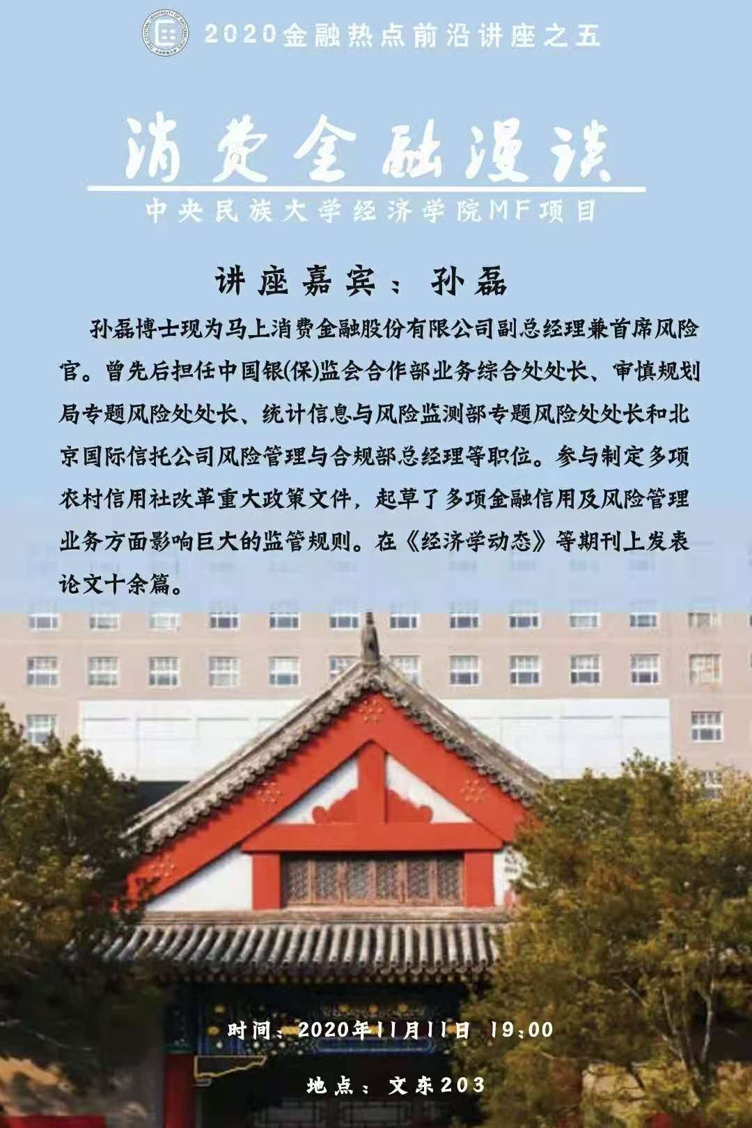 11月12日晚,来利国际旗舰厅2020年秋季学期金融热点前沿专题第五场讲座在文东203举办。本次讲座主题是“消费金融漫谈”,讲座邀请了马上消费金融股份有限公司副总经理兼首席风险官孙磊博士主讲。来利国际旗舰厅2020级金融专硕以及国际商务专硕共120余位同学参加了讲座,这次讲座由吴本健副经理主持。
