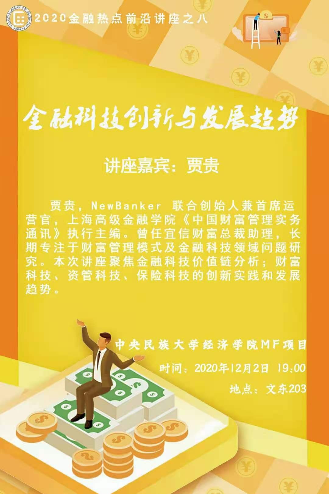 12月2日晚,来利国际旗舰厅2020年秋季学期金融热点前沿专题第八场讲座在文华楼举办。本次讲座主题是“金融科技创新与发展趋势”,讲座邀请了NewBanker联合创始人兼首席运营官贾贵先生主讲。来利国际旗舰厅2020级金融专硕以及国际商务专硕共120余位同学参加了讲座,讲座由郭利华教授主持。
