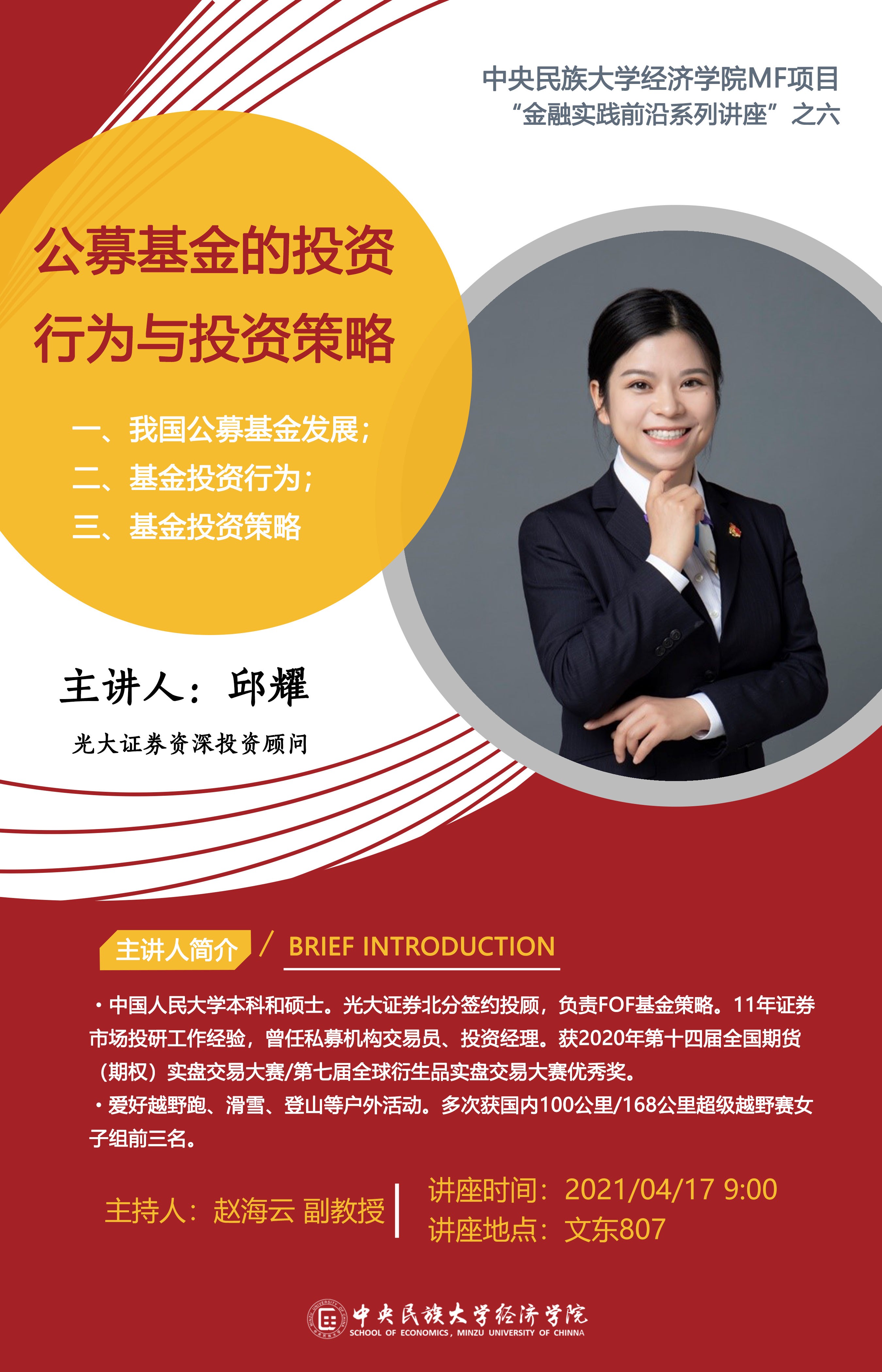 2021年4月17日下午14:00,光大证券北京分公司资深投资顾问邱耀女士受邀于公司文东807进行了题为《公募基金的投资行为与投资策略》的讲座,讲座由公司赵海云老师主持,参会人员包括2019级金融专硕(非全日制)和2020级部分在校生,共计四十余人。