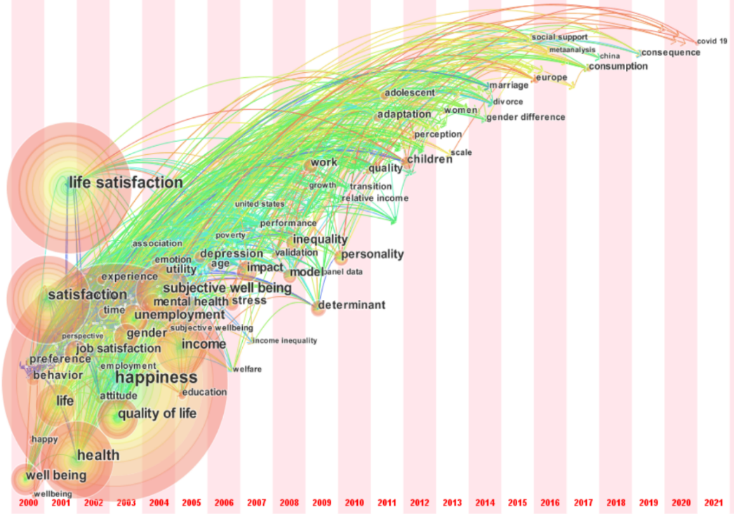 研究以“生活满意度”、“幸福感”、“生活质量”和“幸福度”为关键词,在“Web of Science”中进行了搜索,选取了2000年至2021年间所有相关的5767篇论文,利用“Citespace”软件描绘了生活满意度研究领域的热点和演变。通过梳理,研究将生活满意度的相关因素归纳为个人特征(性别、年龄、受教育程度、身体健康情况、收入等)、家庭特征(婚姻关系、家庭规模、家庭关系、家庭财富等)以及社会特征(经济增长、社会地位、户口等)三个方面。