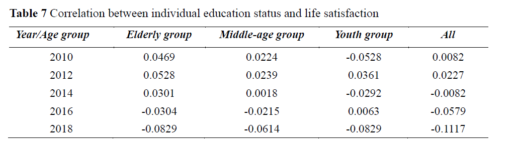 2.教育。随着改革开放的不断推进,在过去的几年里,中国的教育回报率呈下降趋势,年轻人正面临着“学历贬值”带来的困扰。实证结果表明,教育对生活满意度之间的相关性持续下降。因此,教育水平未来较难成为解释国人生活满意度的关键变量,这也是正处于转型期的中国的一种特殊现象。