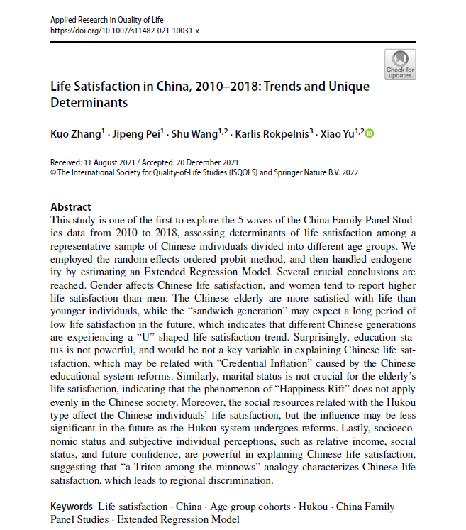 随着经济的快速发展,中国人民对自己的主观幸福感有了更高的期待,生活满意度正成为公众关注热点。近来,于潇副教授团队在对中国人民生活满意度的研究中取得阶段性进展,研究成果以“Life satisfaction in China, 2010-2018: Trends and unique determinants”为题发表在生活质量、幸福研究领域国际权威期刊“Applied Research in Quality of Life”(SSCI,社会科学交叉学科1区,IF=3.078)上,文章链接:https://link.springer.com/article/10.1007/s11482-021-10031-x