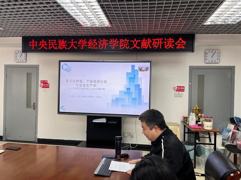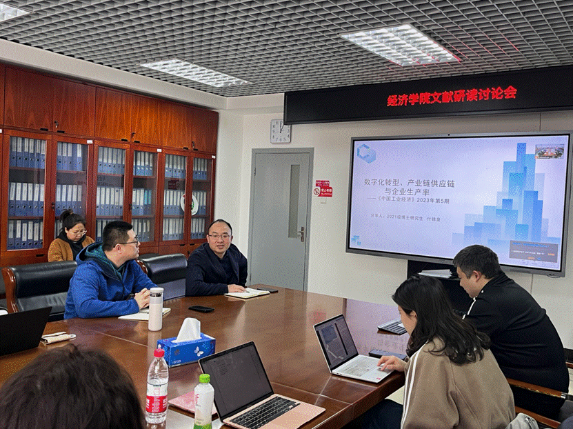 此次文献研读会由21级博士生付锦泉就《中国工业经济》上的论文《数字化转型、产业链供应链韧性与企业生产率》进行分享。付锦泉详细介绍了本篇论文的问题提出、研究框架与逻辑、边际贡献、实证方法和结果,并且在汇报的最后,总结了自己在研读文献中的心得体会和学习到新技术新技能。