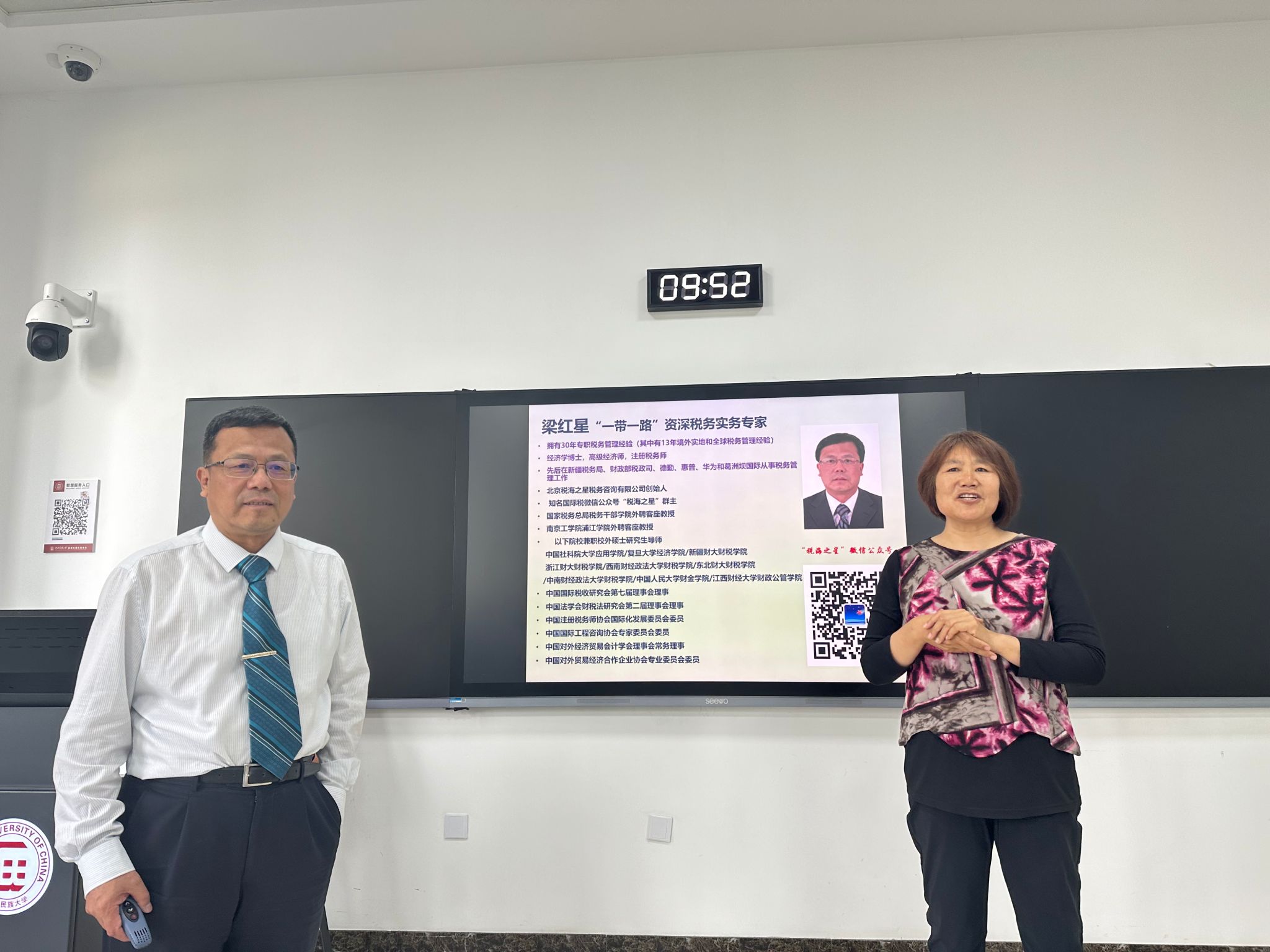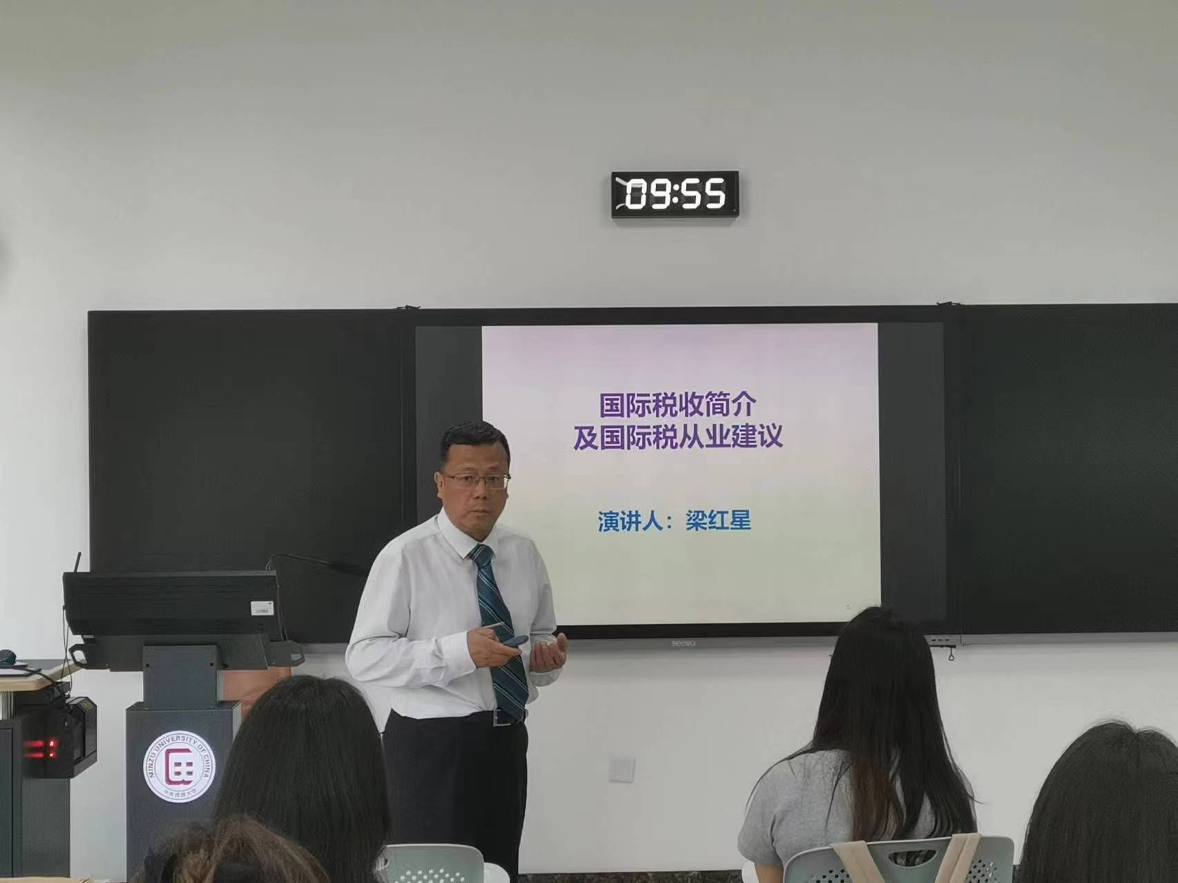 2024年5月10日上午,来利国际旗舰厅“财税前沿与税收实务”第五场讲座在丰台校区明德楼104教室顺利举办。北京税海之星税务咨询有限公司创始人、总经理梁红星先生为税务专硕同学们作了题为“国际税收简介及国际税从业建议”的专题讲座。讲座由史锦华教授主持,财政系主任、税务专硕负责人杨松武副教授参加讲座。