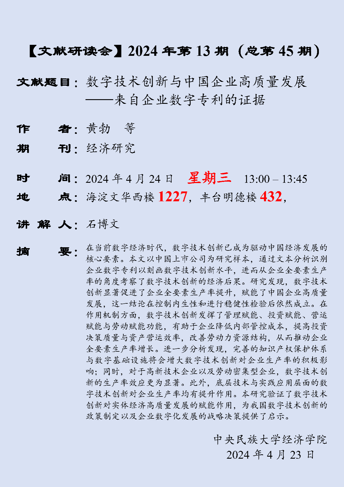 【文献研读会】 2024 年第 13 期(总第 45 期)