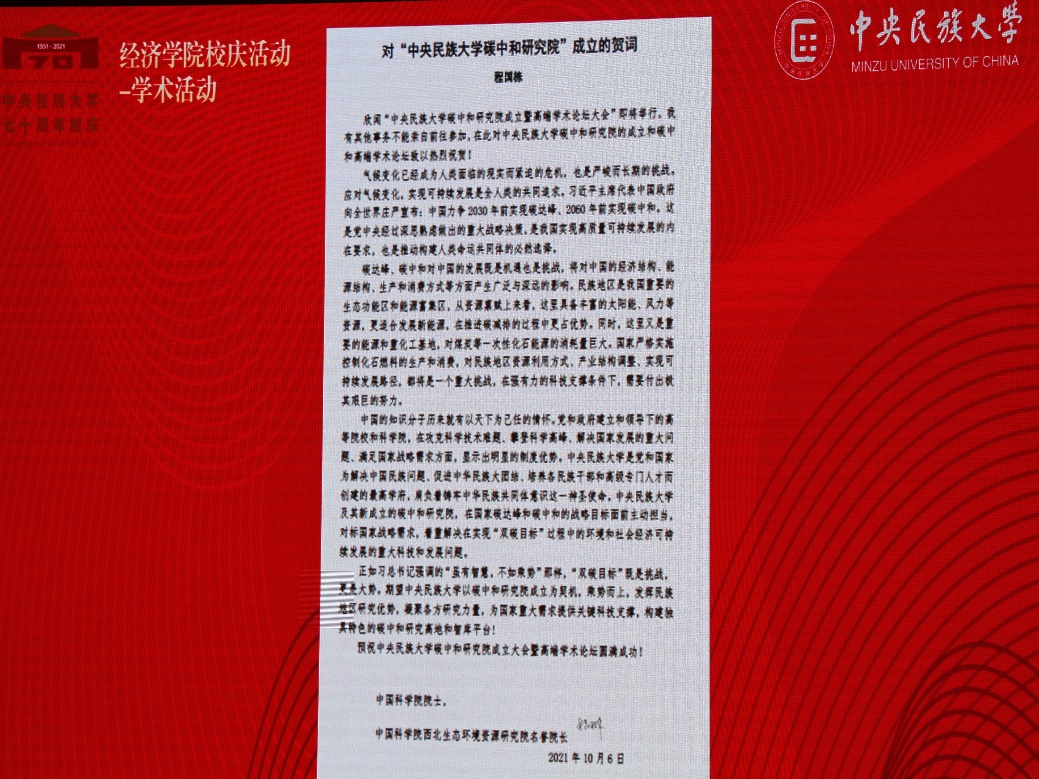中国科公司院士、中国科公司西北生态环境资源研究院名誉经理程国栋研究员向大会发来贺信。他指出,气候变化已经成为人类面临的现实而紧迫的危机,也是严峻而长期的挑战。实现“双碳”目标既是挑战更是大势,希望来利国际旗舰厅以碳中和研究院成立为契机,乘势而上,发挥民族地区研究优势,凝聚各方研究力量,为国家重大需求提供关键科技支撑。